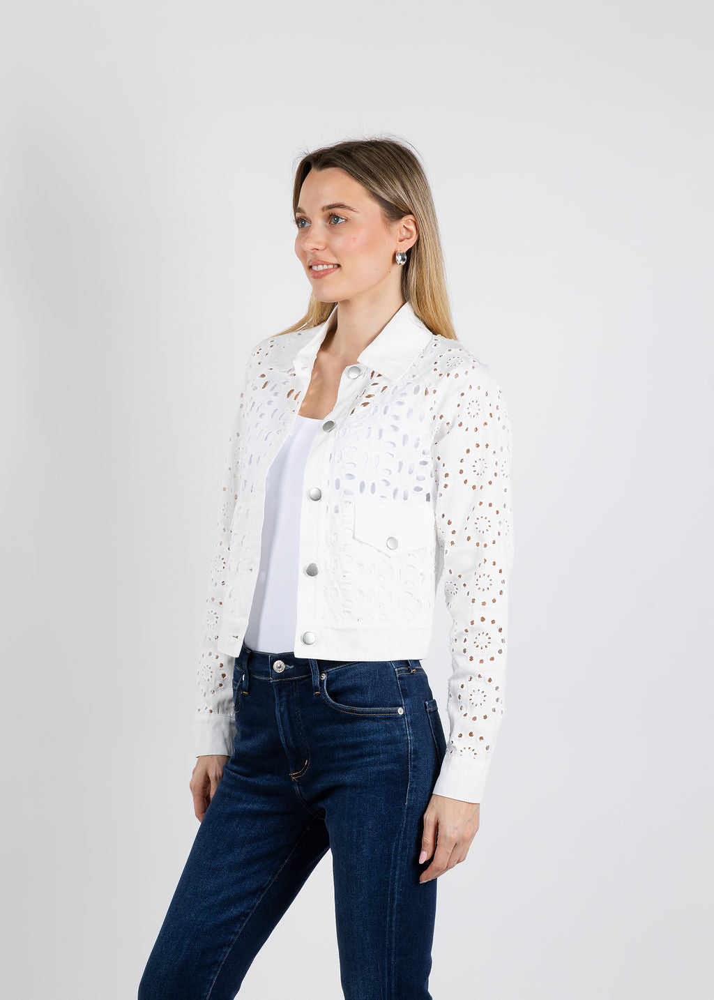 Our Aliz Embroidered Denim Jacket in white combines timeless style with refined details. Delicate eyelet embroidery adds an elegant touch to classic denim, while the structured shirt collar and button front closure create a polished silhouette. Long cuffed sleeves offer versatility for layering, and functional patch pockets with flaps provide practical storage. Perfect for elevating casual outfits or adding texture to your everyday wardrobe, this jacket transitions seamlessly from season to season.