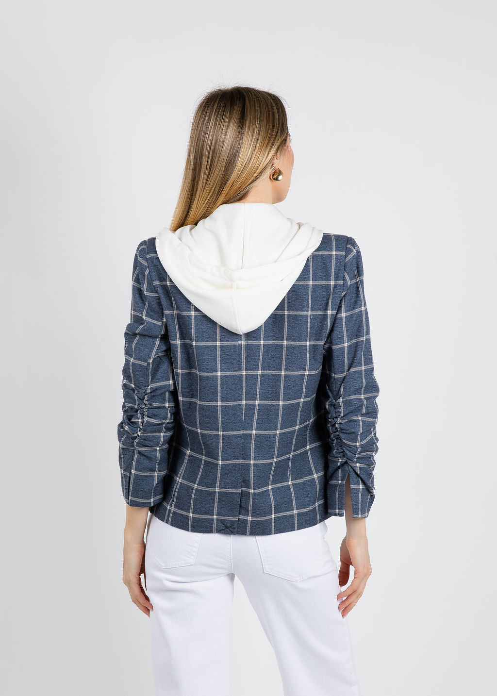 Meet our Dallas Windowpane Dickey Jacket, where refined tailoring meets relaxed layering. This clever hybrid combines a tailored blazer with a soft zip hoodie, so you get sophistication and coziness in one piece. The navy windowpane pattern brings classic elegance, while the cropped cut keeps things modern and flattering against any silhouette. Plus, the functional button front closures and a drawstring hood let you customize your vibe instantly—go polished for work or casual for weekends. When you need an outfit that's both put-together and genuinely comfortable, this jacket delivers.