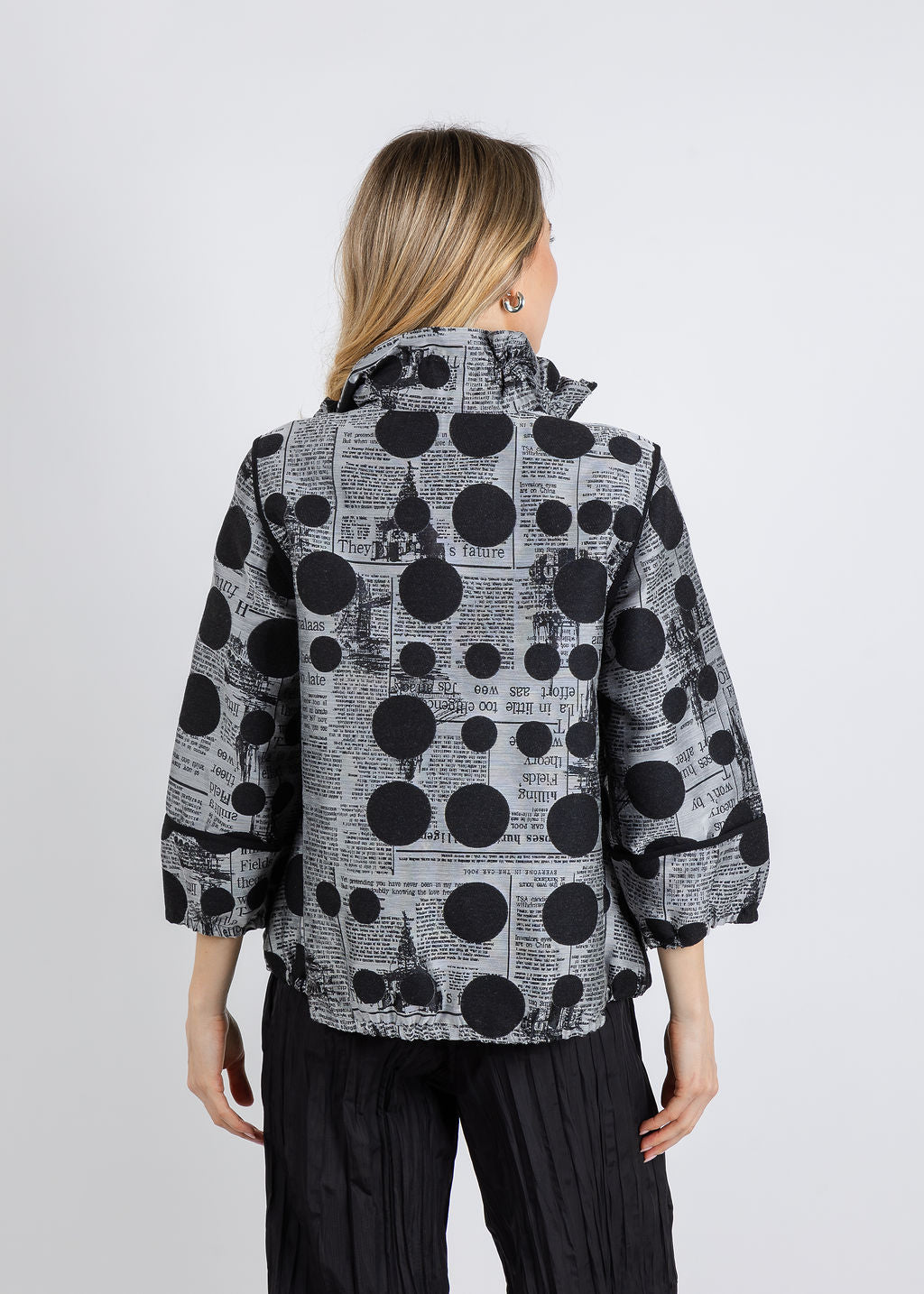 Make a bold statement with our striking Newspaper Jacket, featuring an eye-catching newspaper and dot pattern in black/multi. The ruffled collar adds vintage charm while the red-black zip front creates instant visual interest. Designed with a relaxed boxy silhouette, 3/4 sleeves, and slightly elasticated cuffs and hem for a comfortable, flattering fit. Perfect for layering over your favorite basics, this jacket effortlessly elevates any outfit with personality and style.