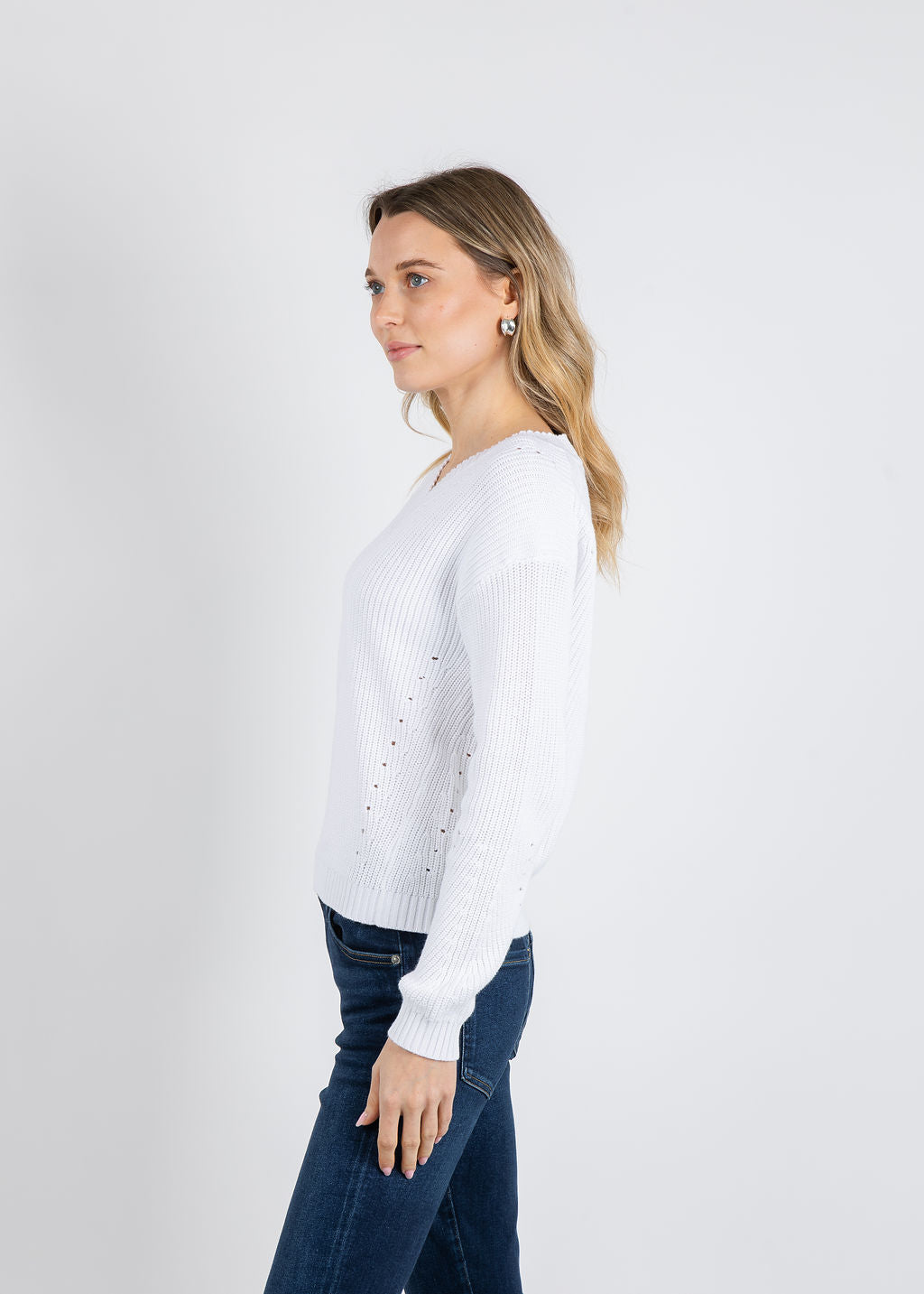 Our Vicky V-Neck Shaker Sweater in crisp white combines effortless elegance with cozy comfort. Featuring a flattering V-neckline and on-trend dropped shoulders, this piece offers a relaxed yet refined silhouette that works beautifully layered or worn solo. The textured shaker knit adds visual interest and dimension, while long sleeves provide warmth without bulk. Perfect for transitional seasons or layering year-round, this versatile sweater elevates any casual wardrobe with understated sophistication.