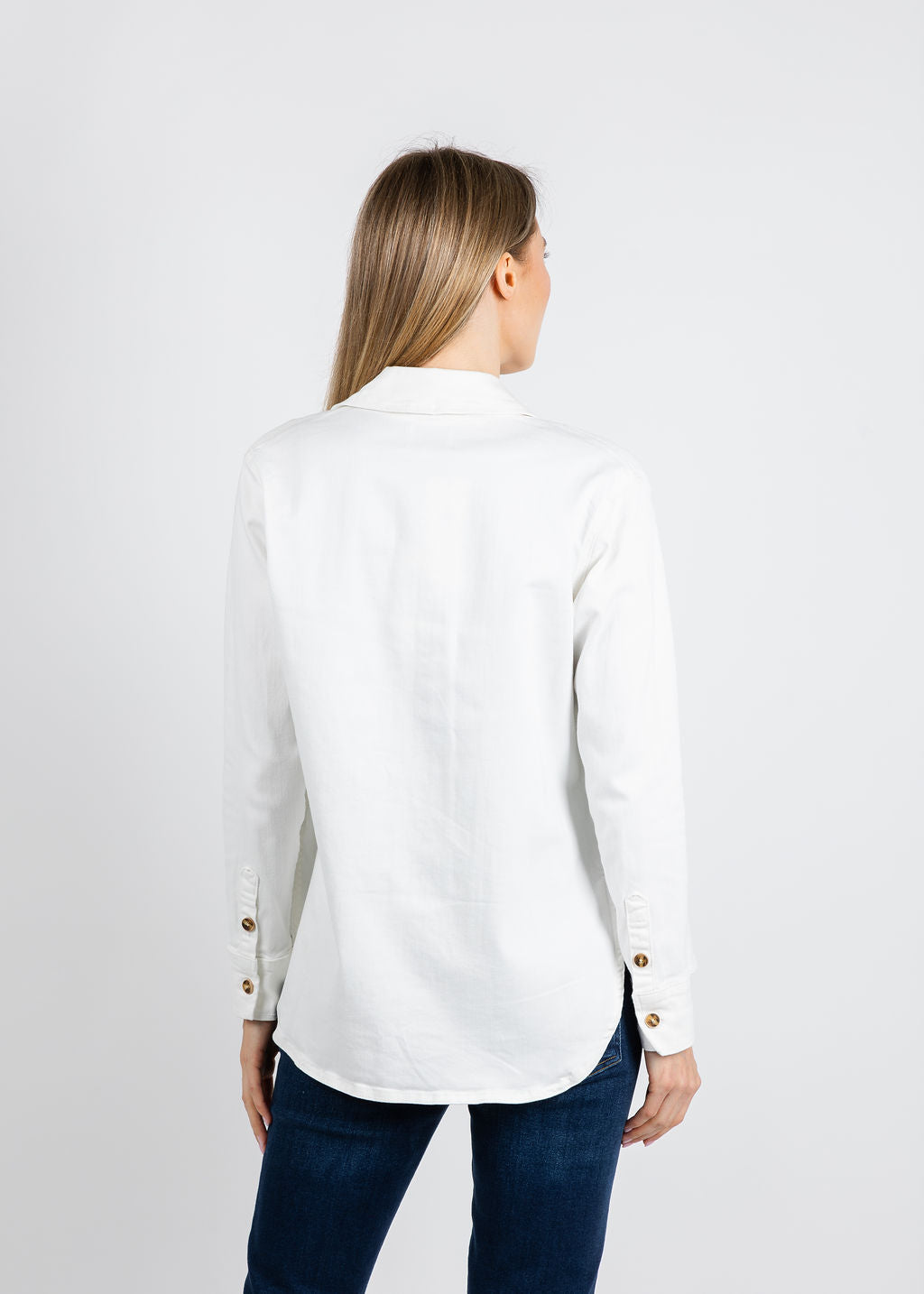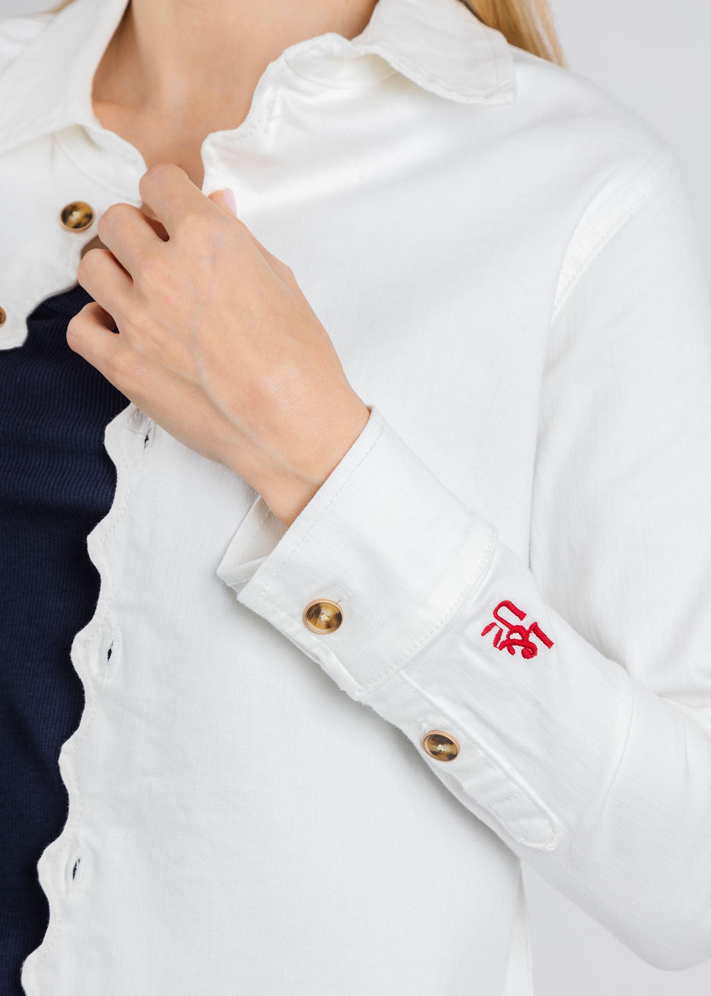 A feminine twist on a classic wardrobe staple, Leo & Ugo's Grace Denim Shirt elevates everyday denim with delicate scalloped detailing along the button placket. Crafted from soft, lightweight denim, this versatile shirt offers a polished yet relaxed look that can be worn buttoned up as a blouse or layered open as a light jacket. The subtle embroidered logo on the cuff adds a signature designer touch. Wear it layered over a simple tee and dark denim for a fresh casual look, or button it up with tailored trousers and loafers for an elevated everyday outfit.