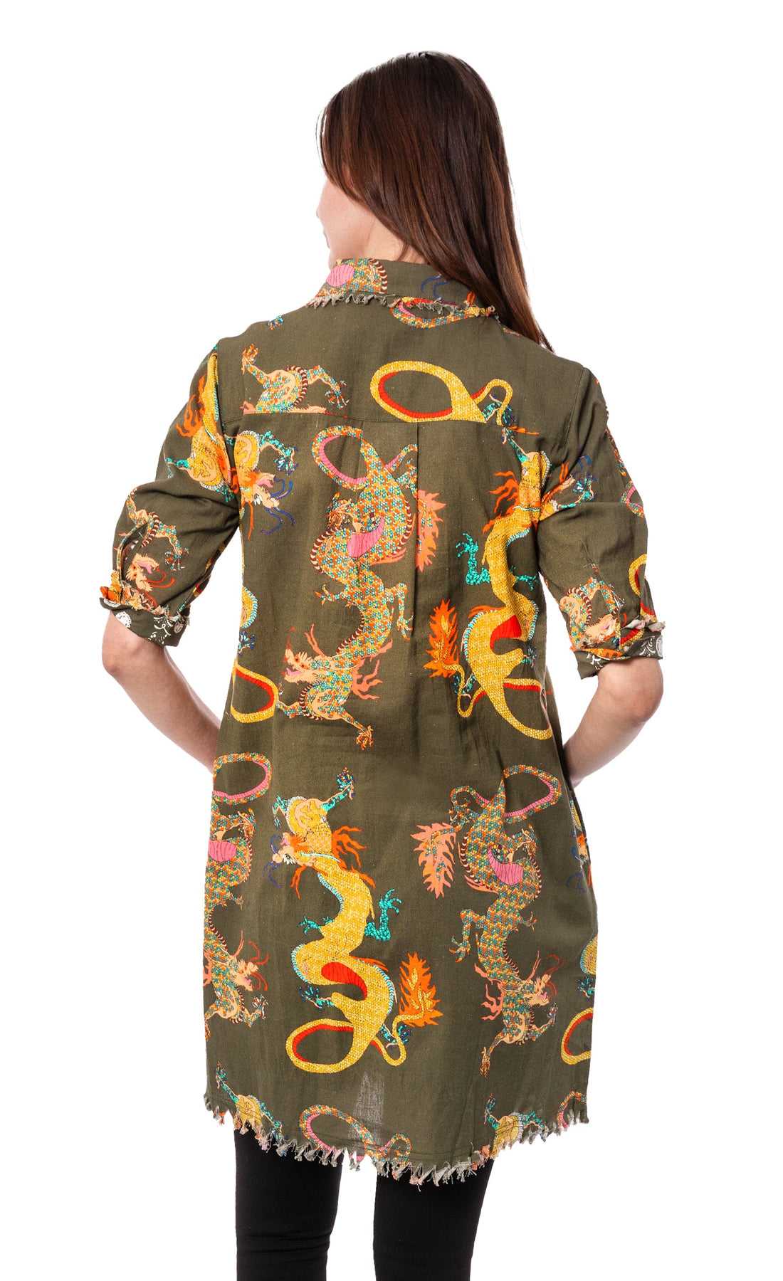 Elevate your style with the Dizzy-Lizzie Olive Dragon Chatham Dress, made from a breathable linen-cotton blend that ensures comfort and durability. This dress features a classic collared style and elbow-length sleeves for a refined look. The billowy silhouette and fringed hemline add a graceful, flowing movement, while the unique dragon print brings an artistic and bold touch. Perfect for those who seek a blend of sophistication and creativity, this dress is ideal for both everyday wear and special occasions, offering a standout style that combines comfort with elegance.