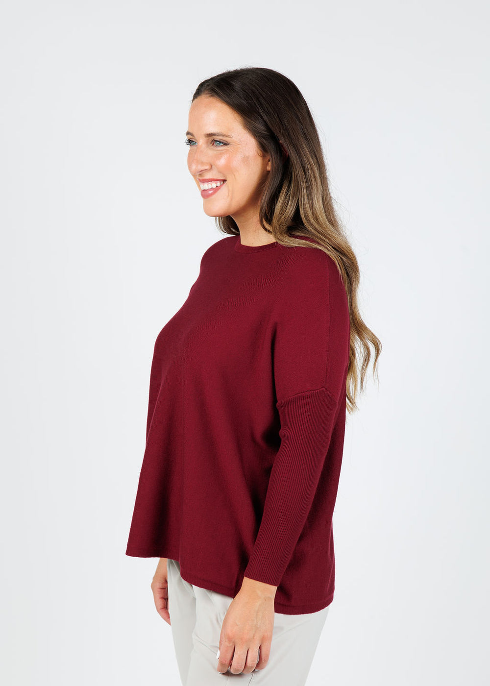 Effortlessly refined, our Bodie Boxy Crew Sweater in Dark Cherry combines modern minimalism with timeless elegance. Crafted from a luxe viscose-blend knit, it drapes beautifully while maintaining a smooth, polished finish. Its boxy silhouette and dropped shoulders create a contemporary fit that flatters and moves with ease, making it a versatile staple for any season. Pair with slim trousers and sandals for a daytime off-duty vibe or with a black midi skirt and sleek ankle boots for a chic evening look.