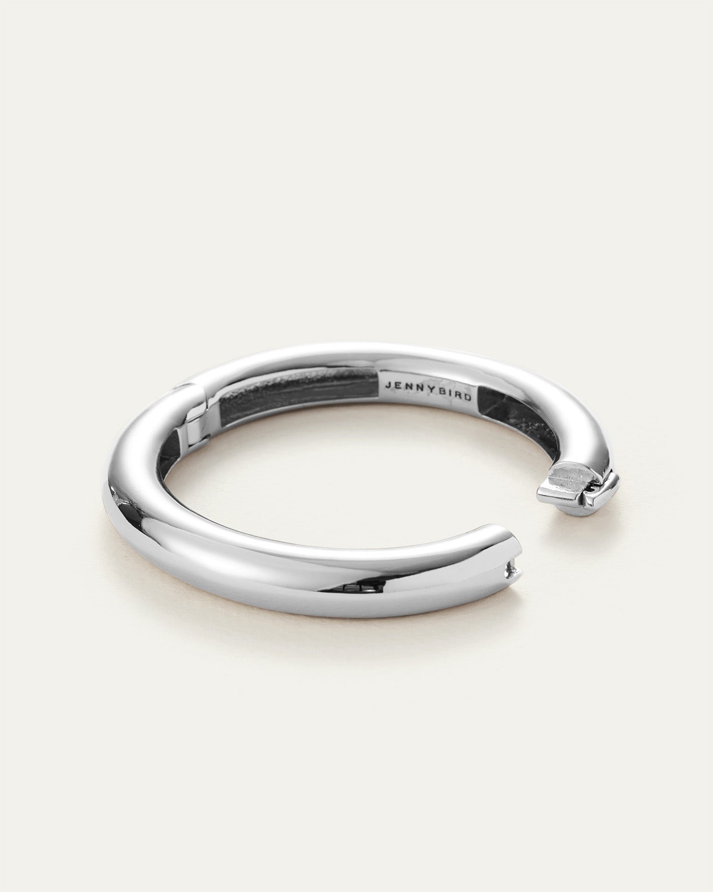 Add effortless sophistication to any outfit with the Jenny Bird Gia Mega Bangle in Platinum. This bold, tubular bangle is the jewelry equivalent of a classic white T-shirt, versatile and essential. Its thick design features a secure hinge and tab lock closure; simply press down on the clasp's highest point to open, and close until you hear a click to lock. Whether worn alone or layered with other pieces, this sleek, high-polish silver bracelet makes a powerful statement.