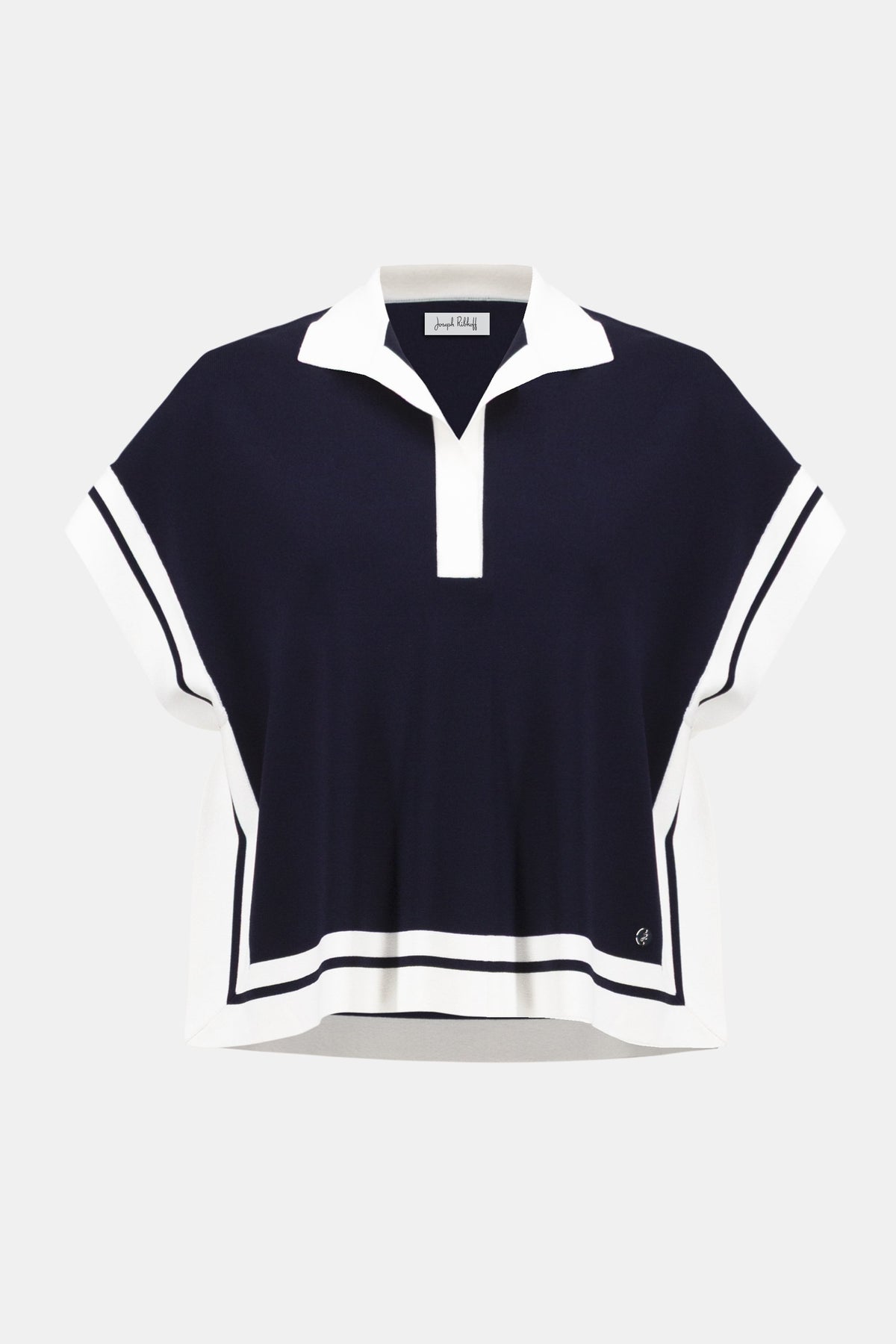 Elevate your wardrobe with this Joseph Ribkoff Boxy Collared Sweater featuring a striking border stripe design. Made from a blend of dry viscose and nylon yarn, its full needle stitch delivers rich texture and lasting comfort. The modern silhouette is enhanced by extended shoulder short sleeves, a contrast-colored polo collar, and side slits at the hem that allow for effortless movement. Perfect for those seeking effortless style and comfort in one chic piece.