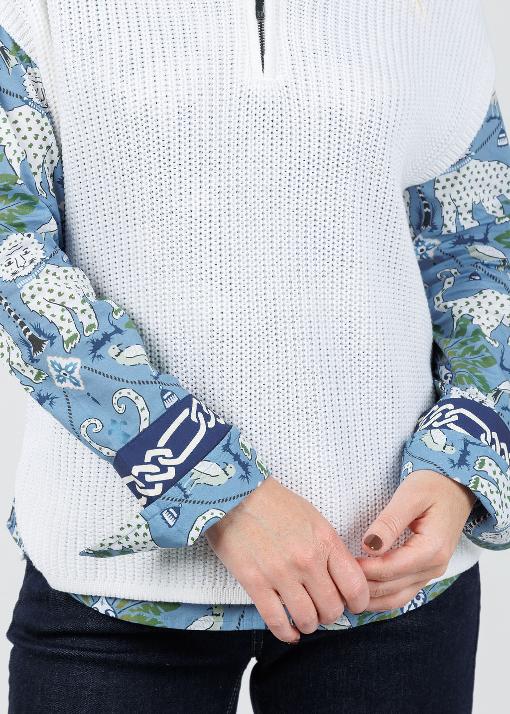 - Gold tone half-zip collar