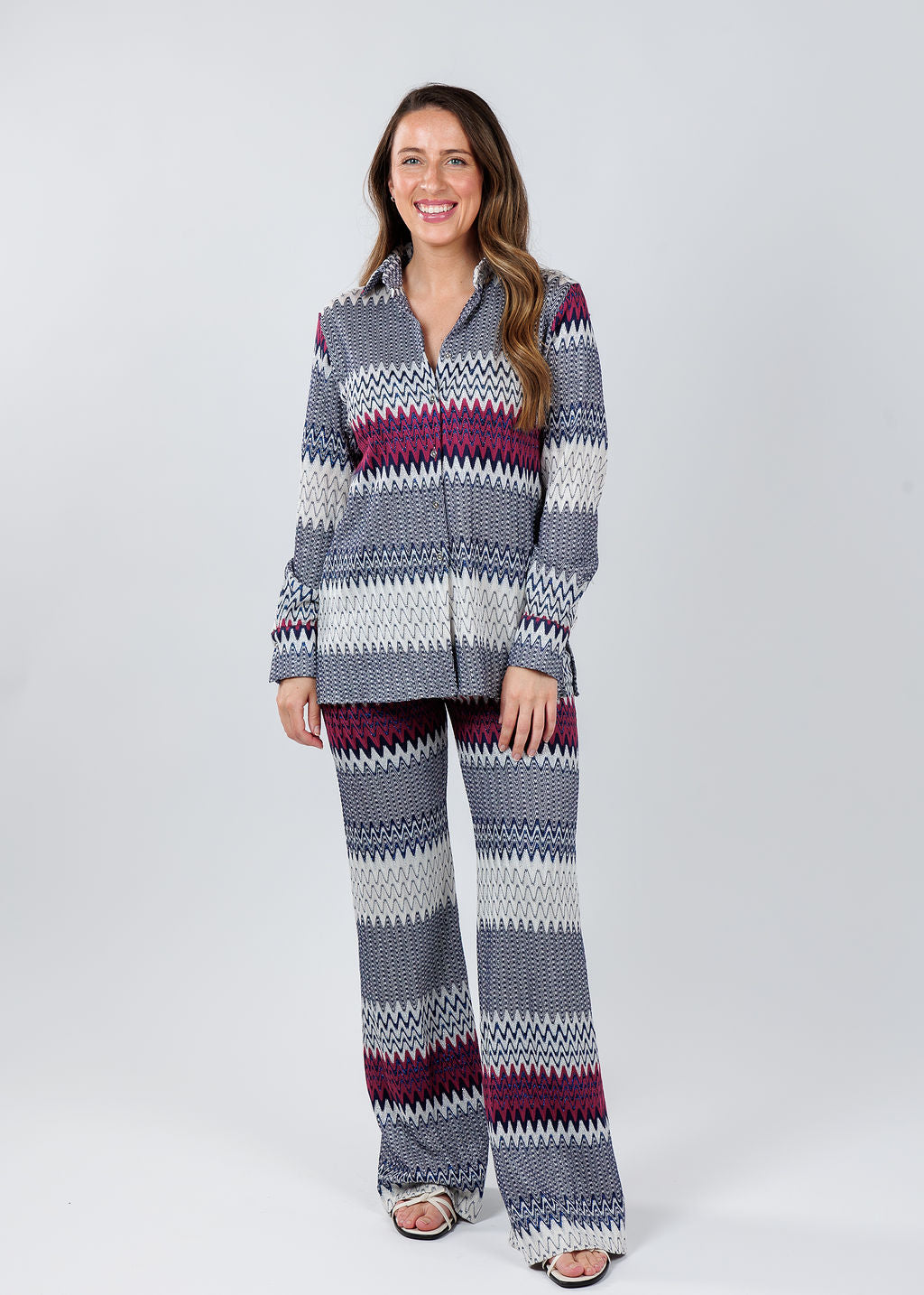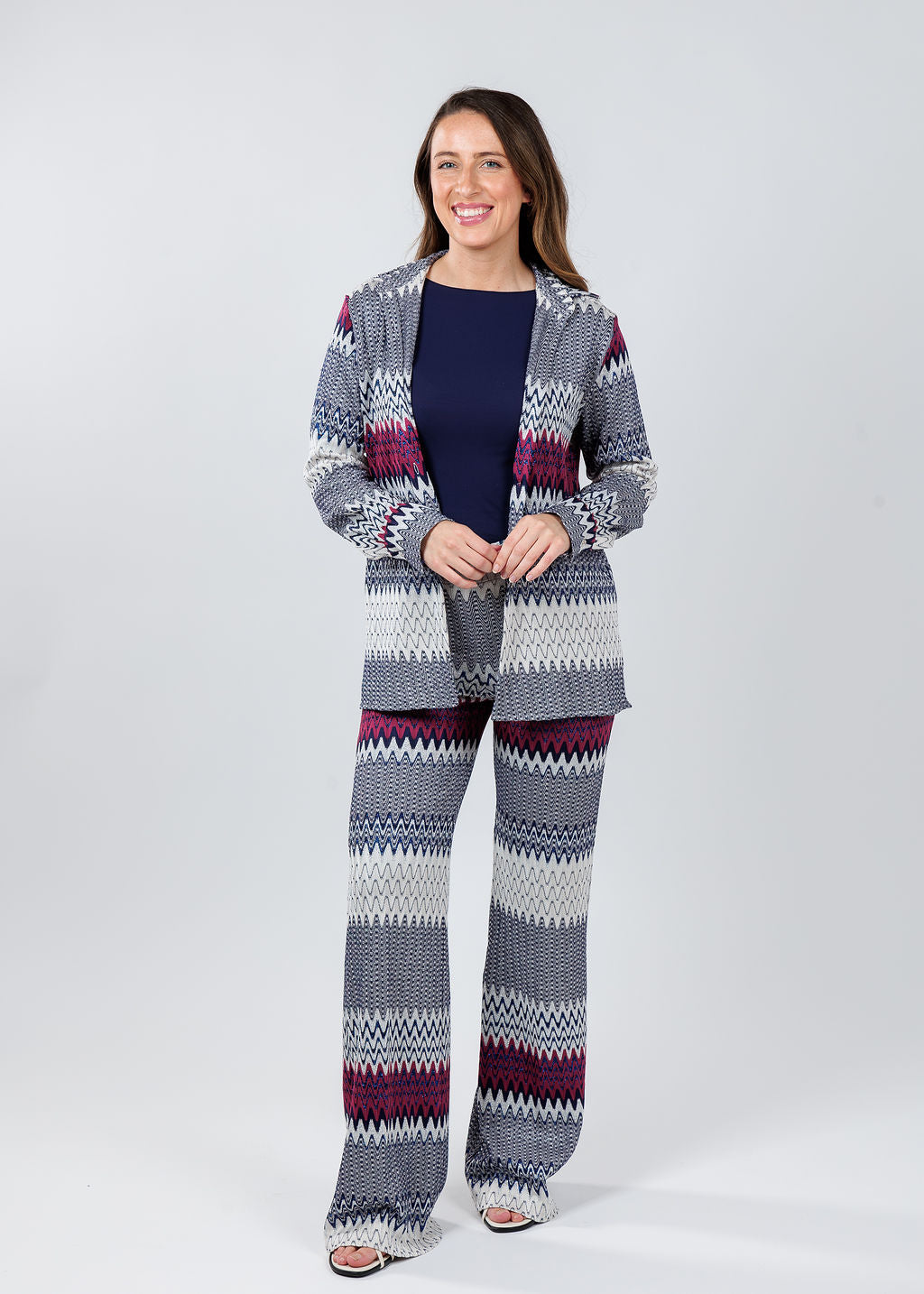 Make a bold statement in Vilagallo's Venus Marino Pants featuring a retro-inspired chevron zigzag knit in striking shades of navy, ivory, and berry. These wide-leg trousers combine comfort and flair with a soft, stretchy fabric and a flattering high-rise waistband. Pair them with a fitted top or classic button-down to let the vibrant pattern take center stage - perfect for when your wardrobe needs a pop of playful sophistication!