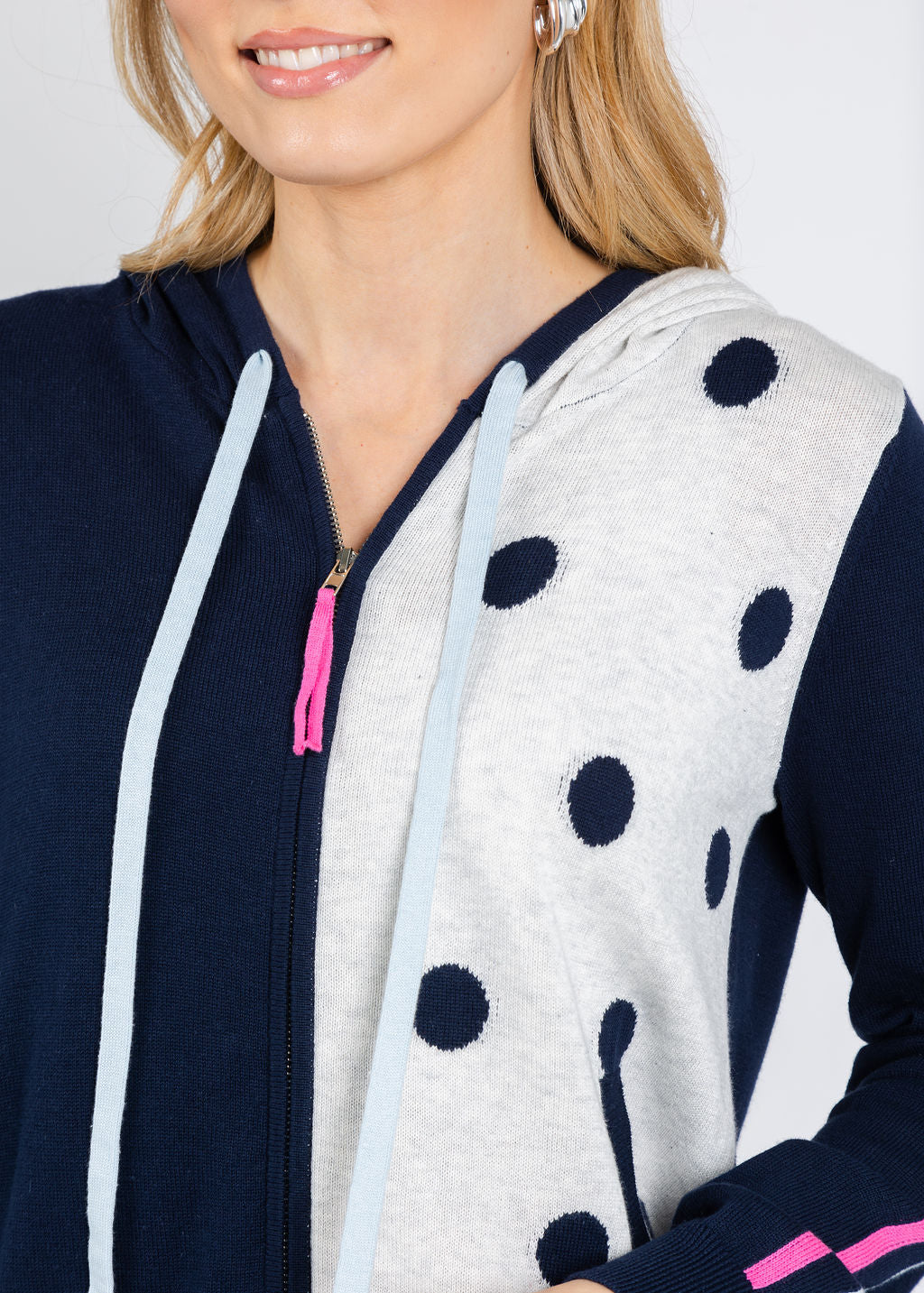 The Zaket & Plover Ophelia Dot Hoodie blends playful polka dots with sporty contrast details. Its zip-front design and hood add casual functionality while the mixed patterns elevate the overall look. A fun yet wearable piece for relaxed days. Pair with classic jeans and sneakers for an easy off-duty outfit, or layer over a tee for added dimension.