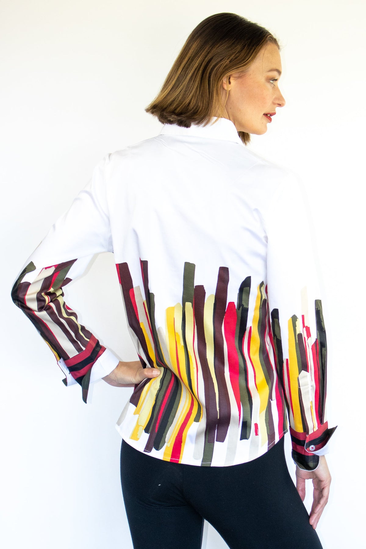 Elevate your wardrobe with the perfect blend of timeless and contemporary with this Dizzy-Lizzie Rome Shirt in Fall Colors Brushstroke Print. This long-sleeve shirt features a beautiful brushstroke print, providing a unique and eye-catching design that will make a statement. Crafted with pure cotton, it offers unbeatable comfort while staying fashion-forward.