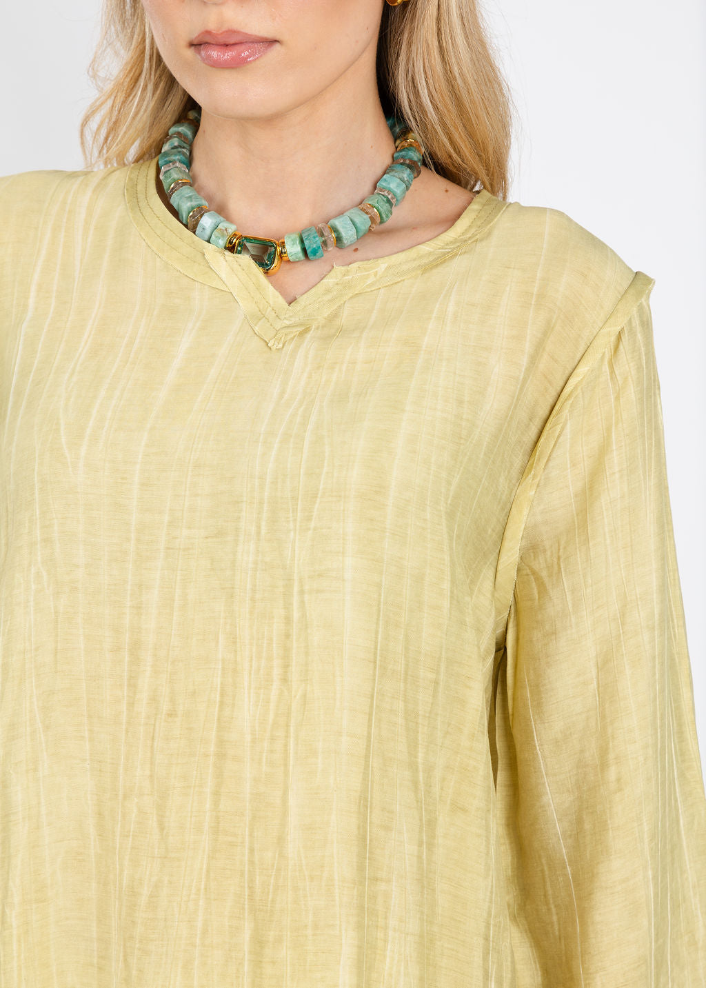 The Ozai N Ku Aida V-Neck Tunic in Yellow combines luxurious comfort with effortless style. Crafted from a premium blend of viscose and nylon, this piece drapes beautifully while maintaining its shape. The flattering V neckline and three-quarter sleeves offer a refined silhouette, while the asymmetric hem adds contemporary flair. Perfect for layering or wearing solo, this versatile tunic transitions seamlessly from casual days to evening occasions. Elevate your wardrobe with a piece that balances sophistication and wearability.