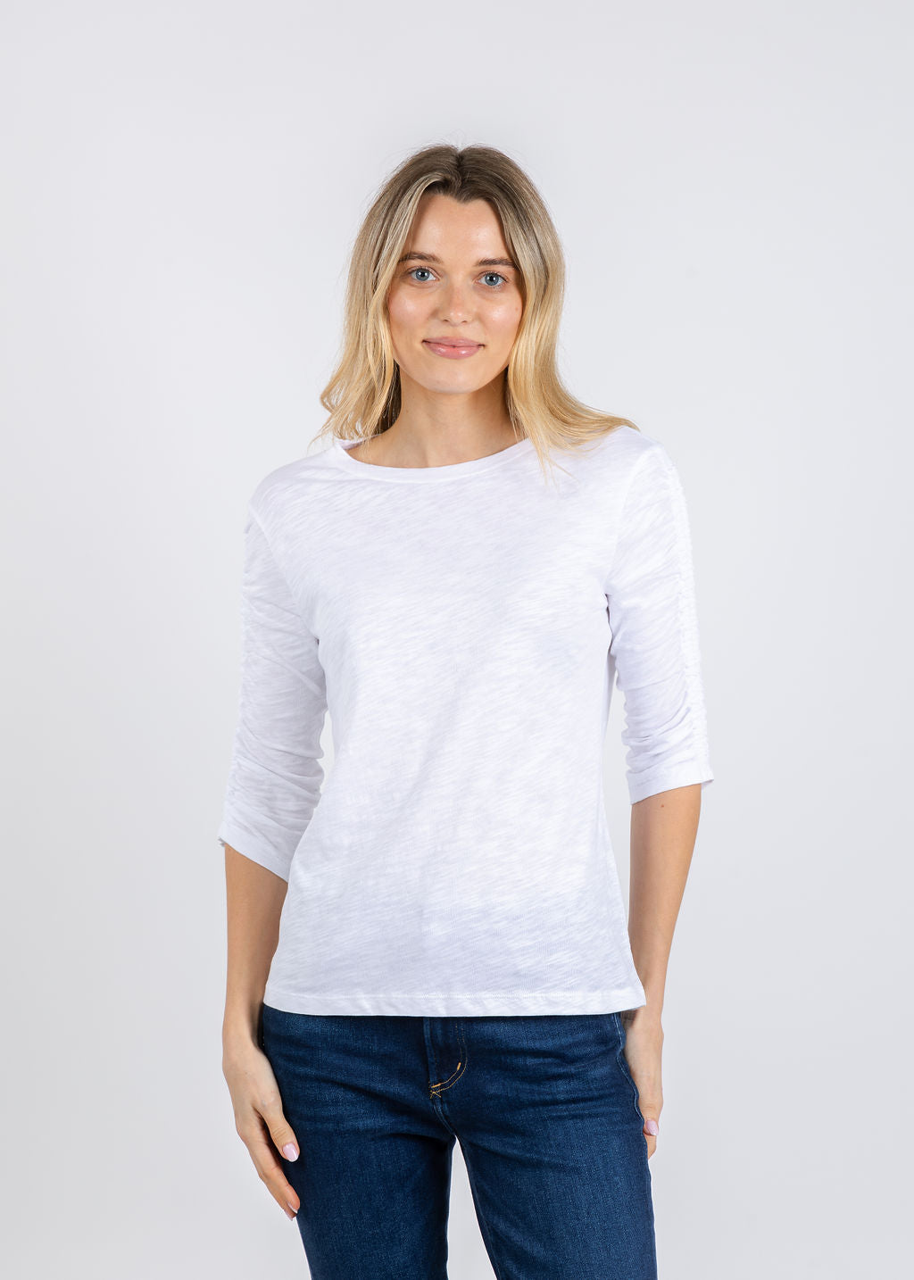 Upgrade your casual style with the Elliott Lauren Crissy Ruched Sleeve Tee in White. Crafted from soft 100% cotton, this versatile top offers breathable comfort with subtle sleeve detailing that elevates a classic silhouette. With a variety of richly dyed colors to choose from, you'll find the perfect match for your unique style. Tuck it into tailored pants for a clean daytime look or wear it loose with denim and sneakers for effortless off-duty style.