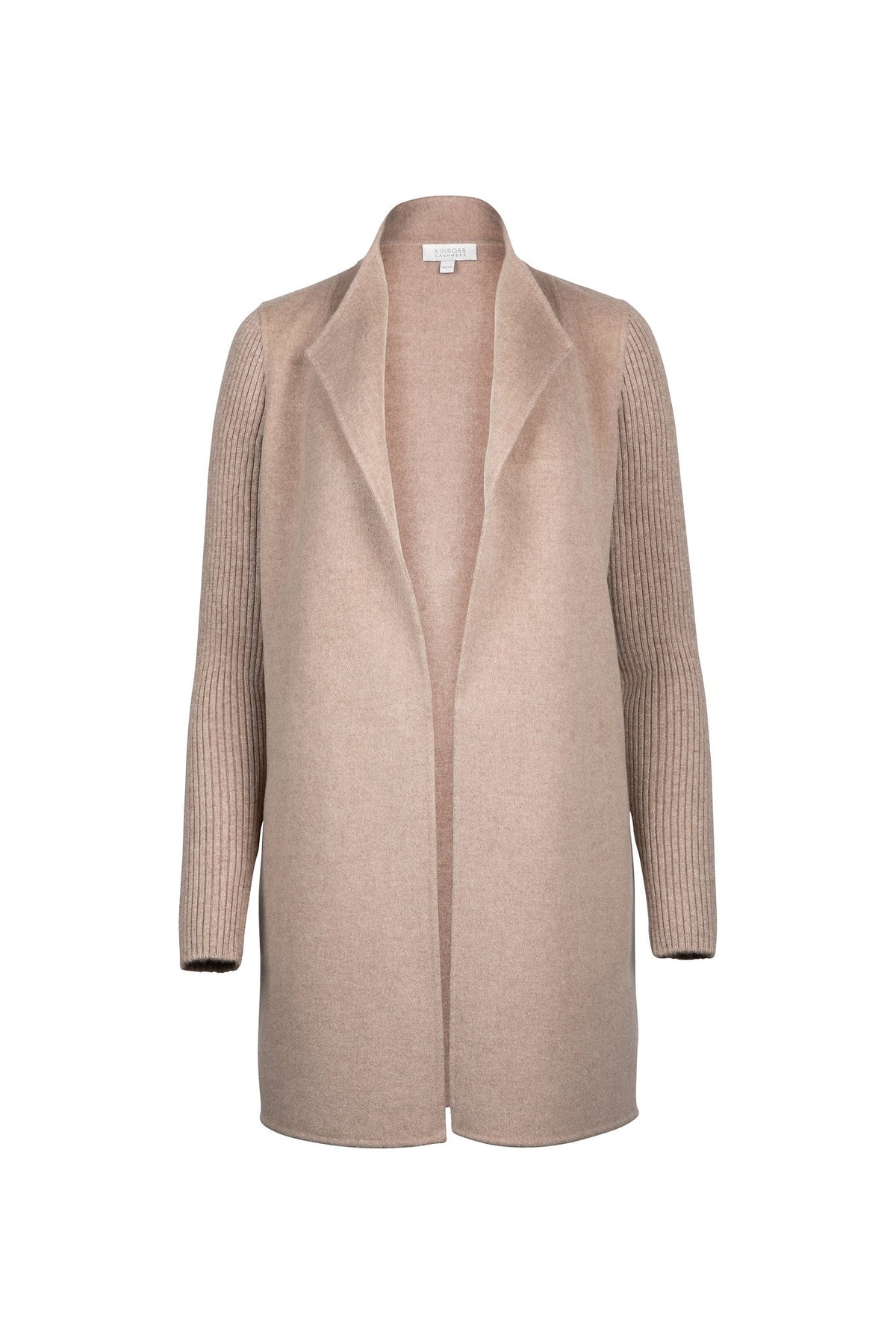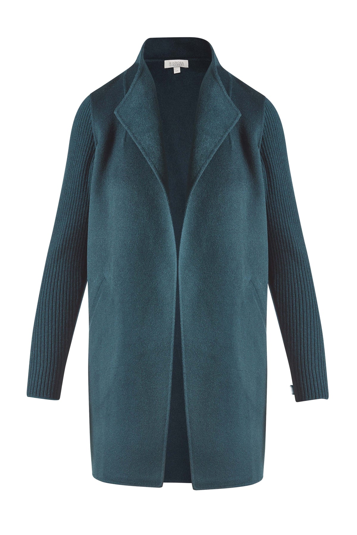 Elevated and effortlessly refined, the Rib Sleeve Coat by Kinross blends tailored structure with soft knit comfort. Designed with a sleek open-front silhouette, this coat features a smooth woven body paired with ribbed knit sleeves for a modern, mixed-texture look. Layer it over a lightweight knit or blouse with tailored trousers or denim for a polished, everyday look with a cozy edge.