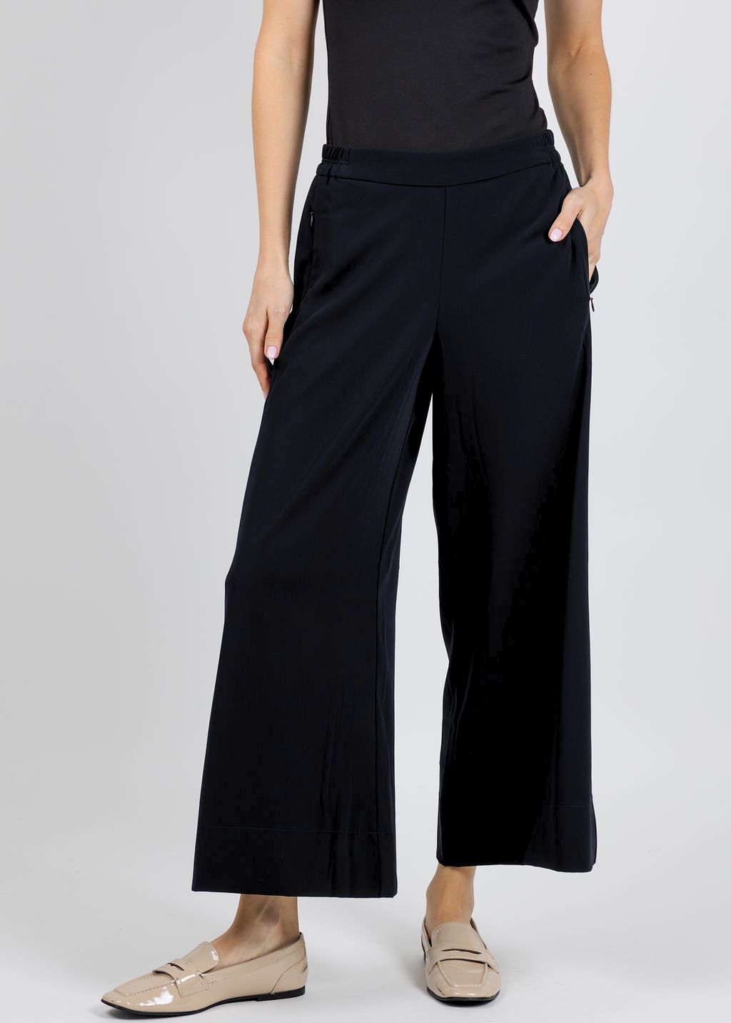 MAC's Coralie Crop Floating Crepe Pants offer a sleek, fluid drape with modern ease. The wide-leg silhouette and elastic waistband deliver comfort without sacrificing polish. Designed in classic black, they transition seamlessly from workday to weekend. Style with a fitted knit or silk blouse and flats for effortless elegance, or add a structured blazer for a refined finish.
