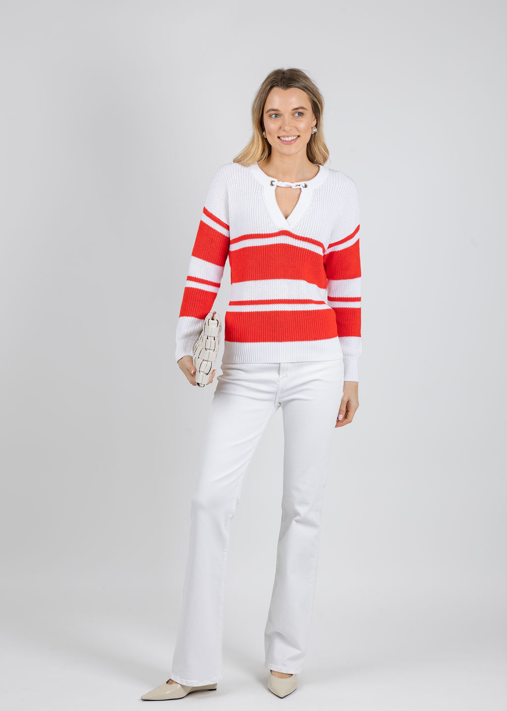 Shaker Stripe Sweater With Crochet Chain Detail - Bleach White/Apple