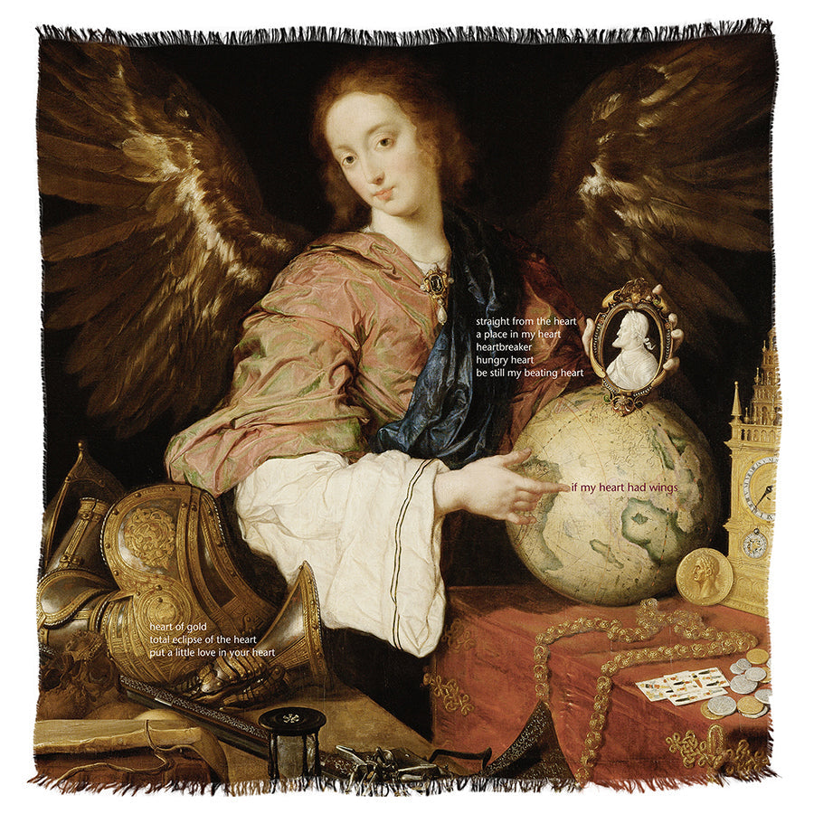 Angelic and adorned with symbolism, If My Heart Had Wings merges the majesty of classical painting with the emotion of timeless song lyrics — all centred around the power of the heart. This scarf soars on the wings of music and emotion. Inspired by Faith Hill’s evocative song and layered with lyrical references from Heart of Gold, Be Still My Beating Heart, and Heartbreaker, the piece channels the universal heartbeat of longing, strength, and vulnerability. The central angel figure cradles the globe, surrounded by relics of history, power, and beauty, as if mapping love across time and space. It’s a conversation between art and music, past and present, body and soul.