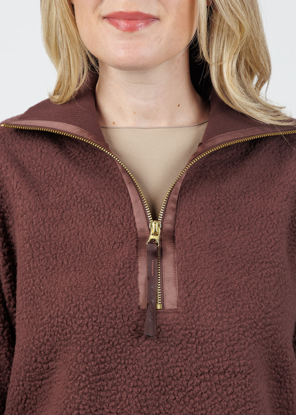 Wrap yourself in playful comfort with Varley's Roselle Half-Zip Fleece Sweater in Deep Mahogany. Made from 100% recycled plush borg fleece, it features a cozy half-zip collar, loose sleeves with ribbed cuffs, and the brand's signature side zip details. Finished with a luxe sateen trim, this sweater adds a fun, stylish edge to your casual wardrobe.