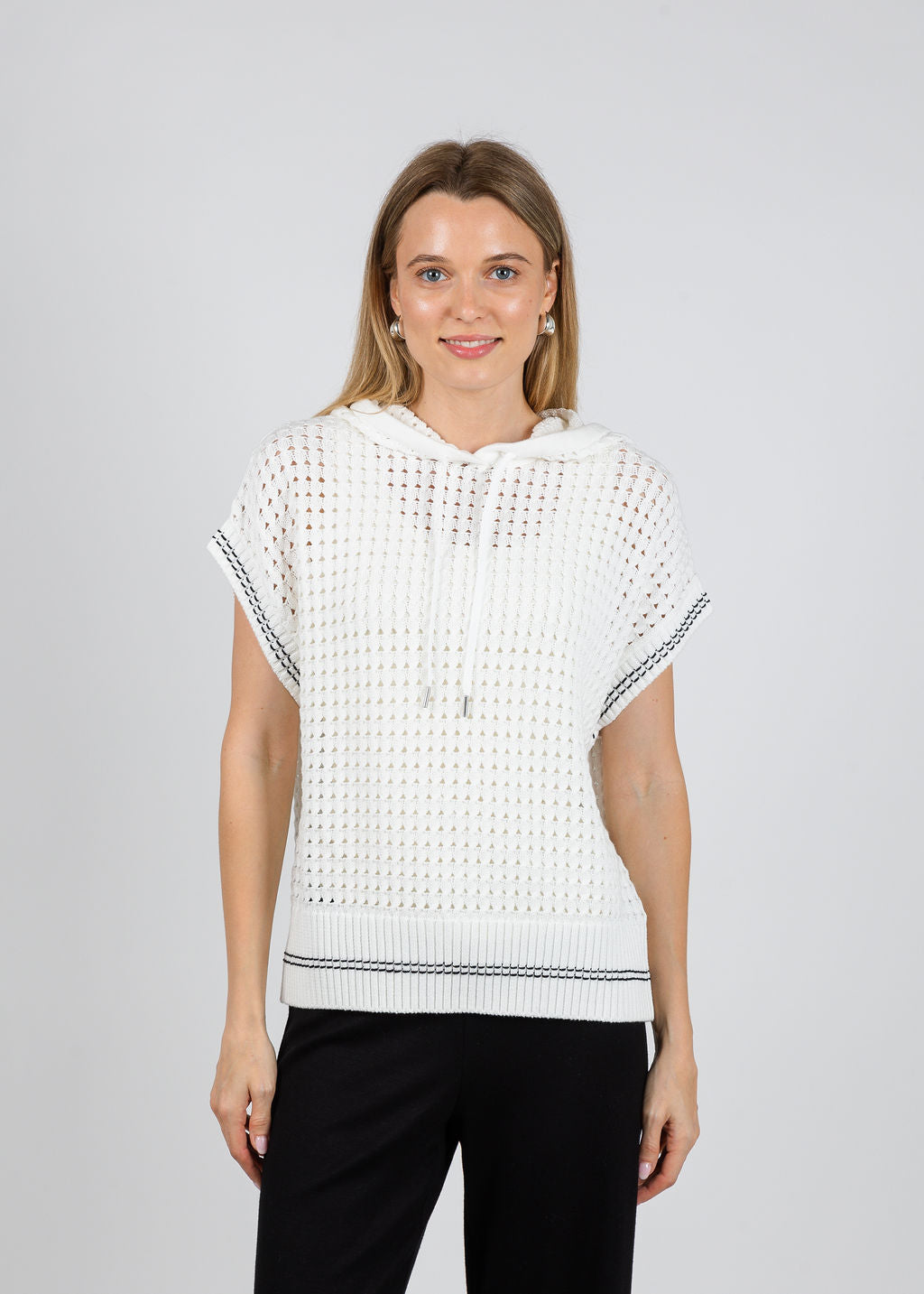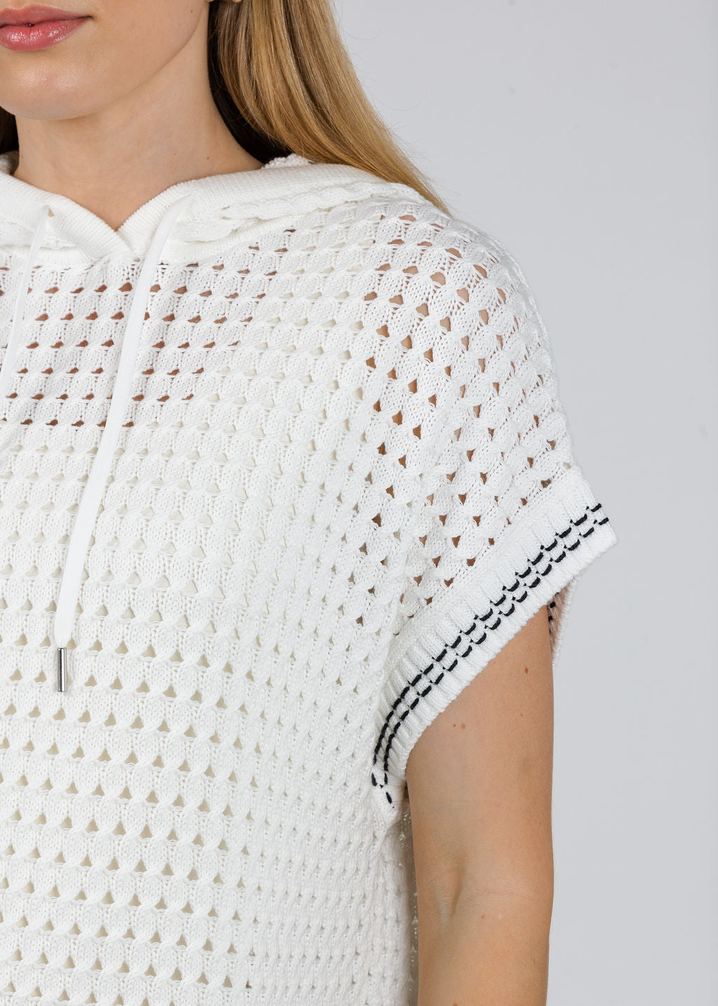 Elevated and effortless, Varley's Vittoria Knit Hoodie blends sporty ease with refined texture. The open-knit design and clean silhouette make it a standout layering piece with a modern, airy feel. Layer over a fitted tank with tailored trousers for a chic athleisure look, or pair with denim for an easy, elevated everyday outfit.